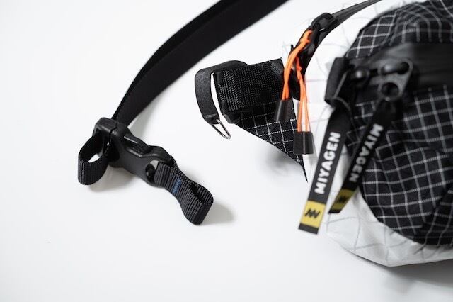 左右には着脱のできるワイヤーゲート式のバックルがあります。このバックルでベルトを簡単に着脱することができます。さらにワイヤーゲート式のバックルでバックパックなど様々なところへ装備することが可能です。