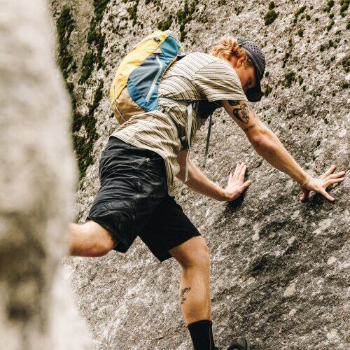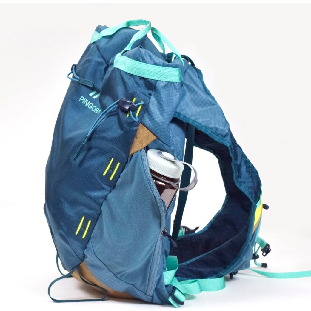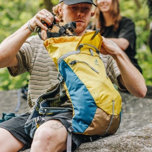 日常使いから日帰りハイク、クライミングシーンでも活躍する多機能バックパック。シンプルな1気室構造ながらも、シンメトリーのショルダーハーネスには500mlボトルやスマートフォンが収納できるポケットが配置され、歩行中でも素早いアクセスが可能です。フレームレス構造のため、アクティブなシーンでも身体に密着しフィット感があります。