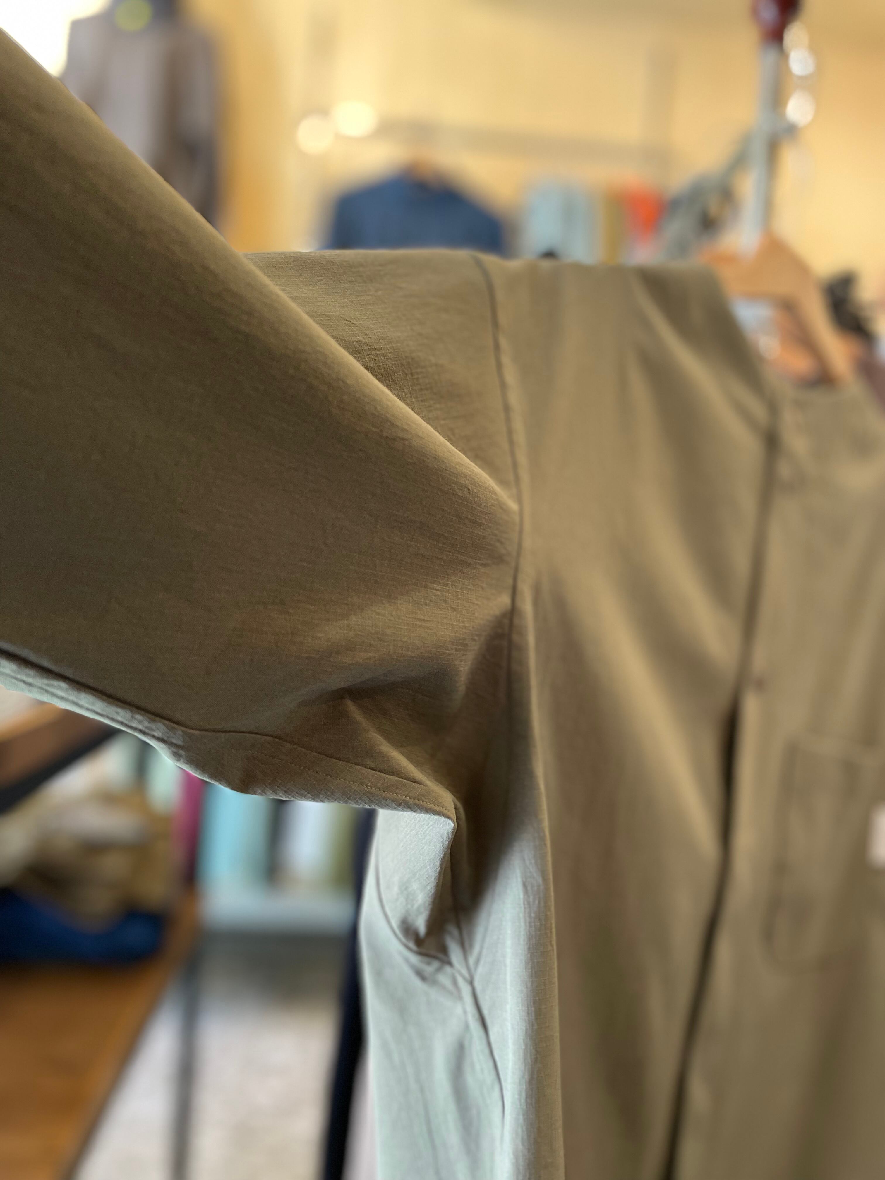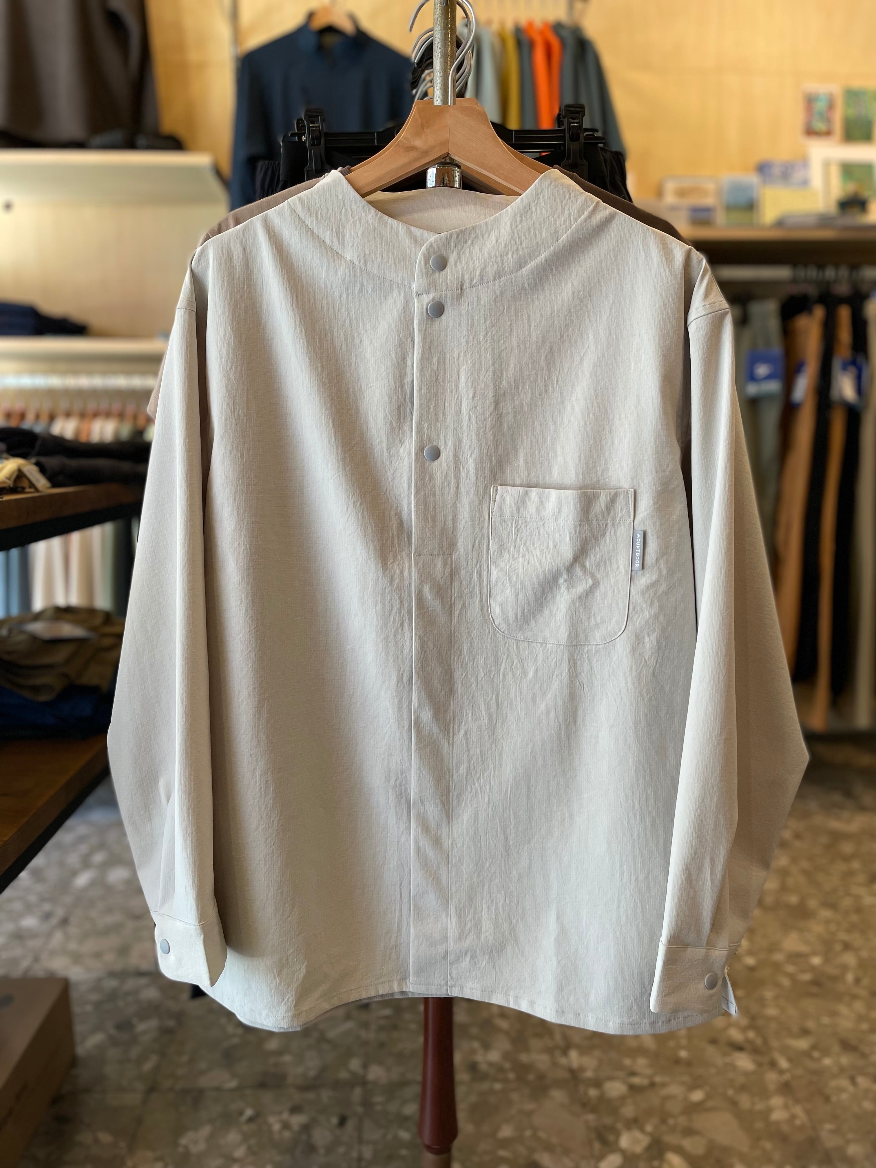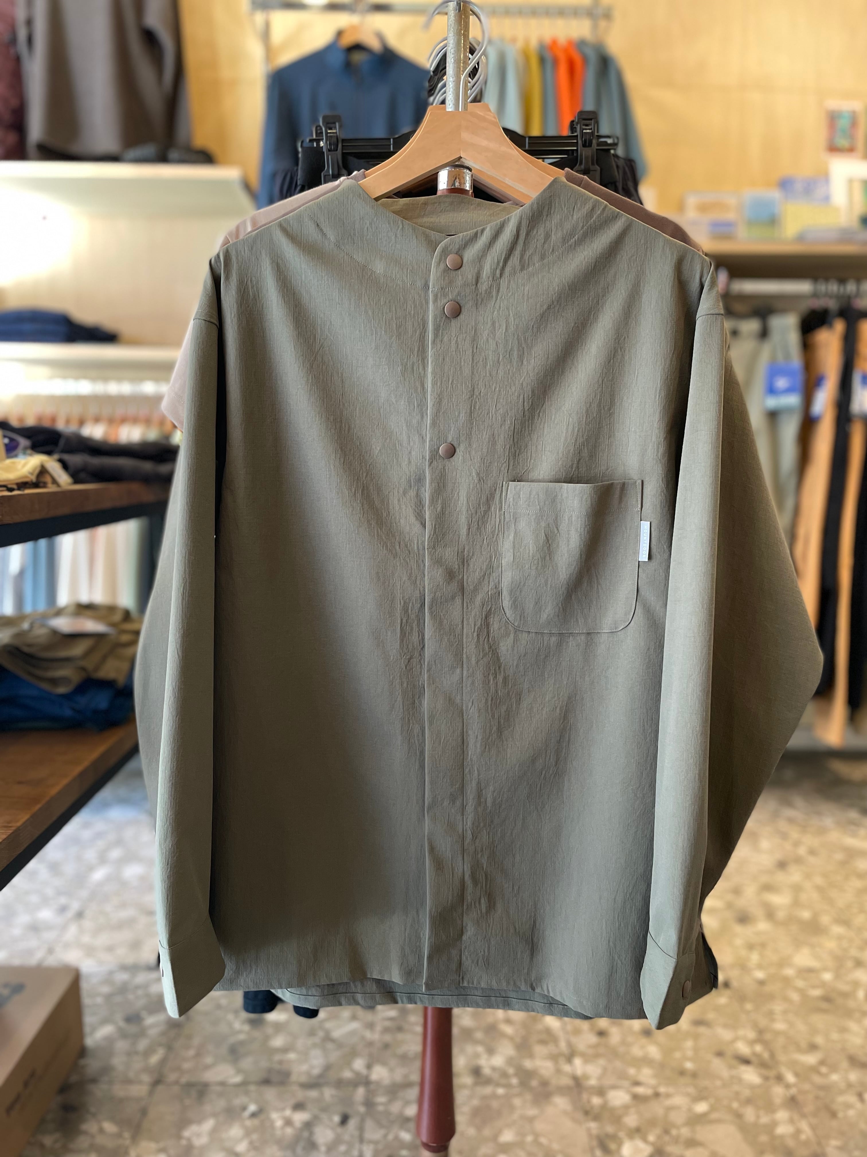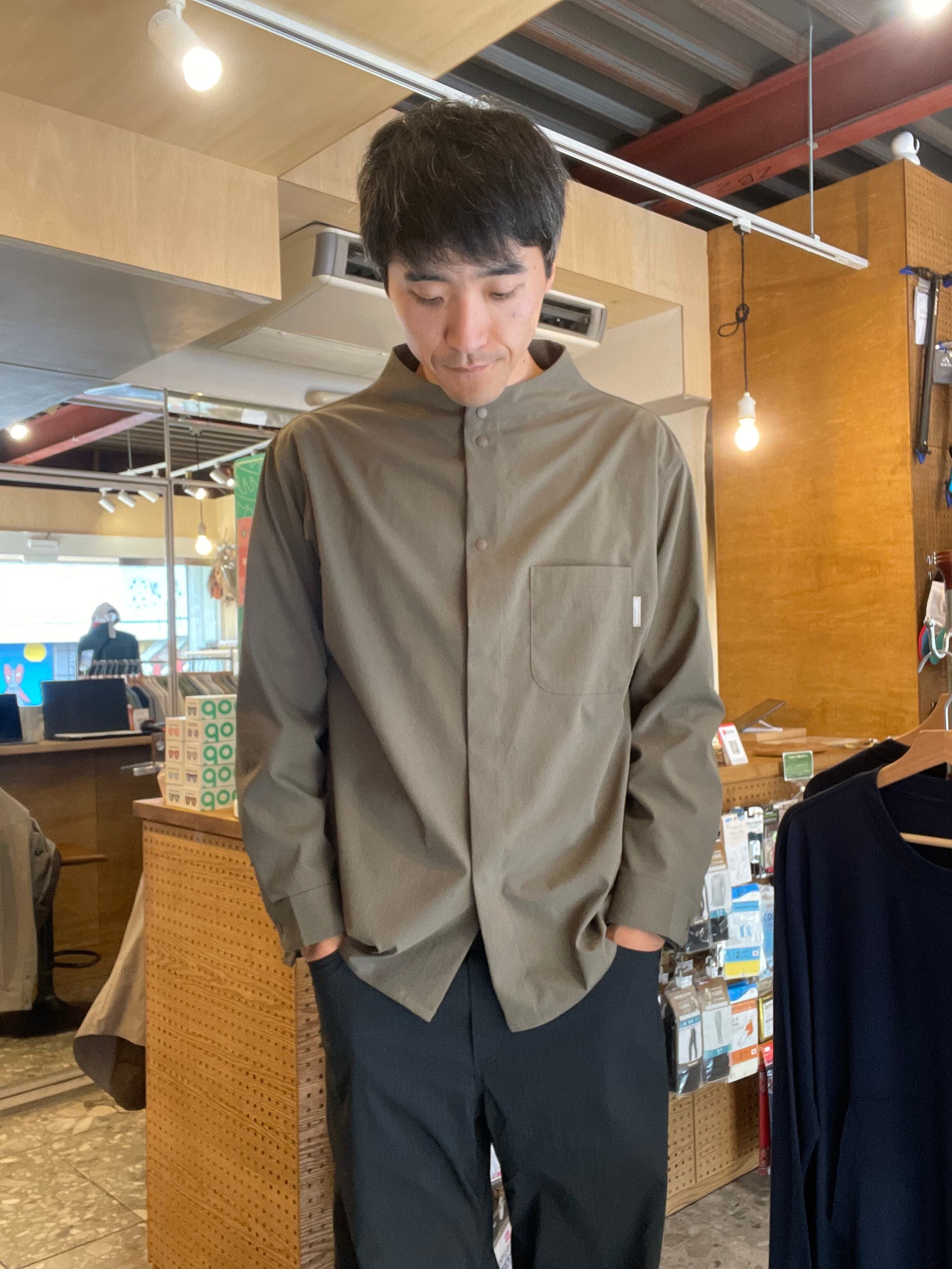 MOUNTDOORのシャツシリーズ特有のゆったりとした首元や、全体に余裕のあるシルエットなど、デザイン性と実用性を両立した仕上がりです。